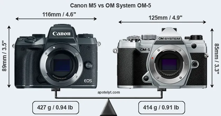 If the front view area (width x height) of the cameras is taken as an aggregate measure of their size, the OM System OM-5 is somewhat larger (3 percent) than the Canon M5. However, the OM-5 is slightly lighter (3 percent) than the M5. It is noteworthy in this context that the OM-5 is splash and dust-proof, while the M5 does not feature any corresponding weather-sealing.
