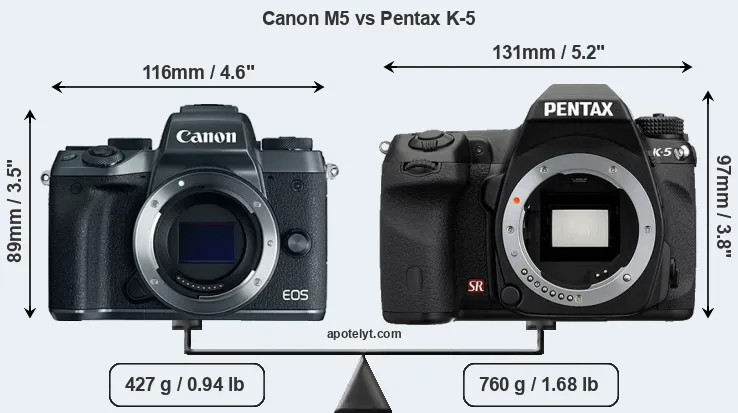 If the front view area (width x height) of the cameras is taken as an aggregate measure of their size, the Pentax K-5 is notably larger (23 percent) than the Canon M5. Moreover, the K-5 is substantially heavier (78 percent) than the M5. It is noteworthy in this context that the K-5 is splash and dust-proof, while the M5 does not feature any corresponding weather-sealing.