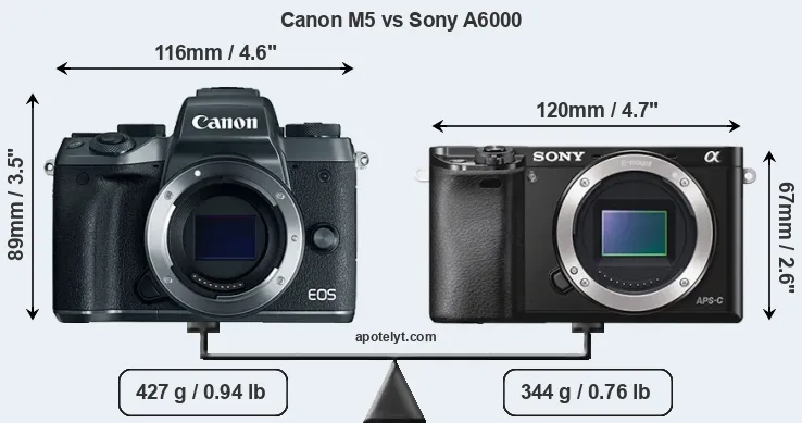 If the front view area (width x height) of the cameras is taken as an aggregate measure of their size, the Sony A6000 is notably smaller (22 percent) than the Canon M5. Moreover, the A6000 is markedly lighter (19 percent) than the M5. In this context, it is worth noting that neither the M5 nor the A6000 are weather-sealed.