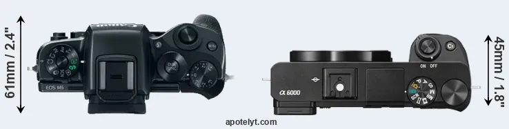 An illustration of the physical size and weight of the Canon M5 and the Sony A6000 is provided in the side-by-side display below. The two cameras are presented according to their relative size. Three consecutive perspectives from the front, the top, and the back are available. All width, height and depth measures are rounded to the nearest millimeter.