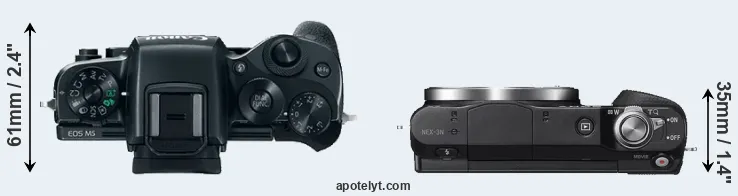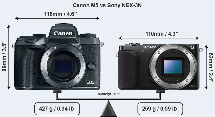 If the front view area (width x height) of the cameras is taken as an aggregate measure of their size, the Sony NEX-3N is considerably smaller (34 percent) than the Canon M5. Moreover, the NEX-3N is substantially lighter (37 percent) than the M5. In this context, it is worth noting that neither the M5 nor the NEX-3N are weather-sealed.