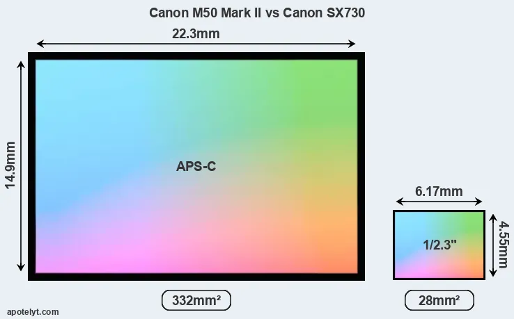 Of the two cameras under consideration, the Canon M50 Mark II features an APS-C sensor and the Canon SX730 a 1/2.3-inch sensor. The sensor area in the SX730 is 92 percent smaller. As a result of these sensor size differences, the cameras have a format factor of, respectively, 1.6 and 5.6. The sensor in the M50 Mark II has a native 3:2 aspect ratio, while the one in the SX730 offers a 4:3 aspect.