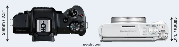 The side-by-side display below illustrates the physical size and weight of the Canon M50 Mark II and the Canon SX730. The two cameras are presented according to their relative size. Three consecutive perspectives from the front, the top, and the back are available. All width, height and depth measures are rounded to the nearest millimeter.