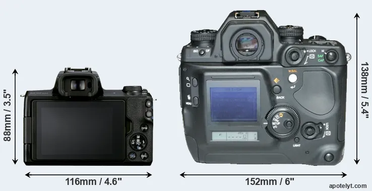 If the front view area (width x height) of the cameras is taken as an aggregate measure of their size, the Contax N Digital is considerably larger (105 percent) than the Canon M50 Mark II. Moreover, the N Digital is substantially heavier (156 percent) than the M50 Mark II. In this context, it is worth noting that neither the M50 Mark II nor the N Digital are weather-sealed.