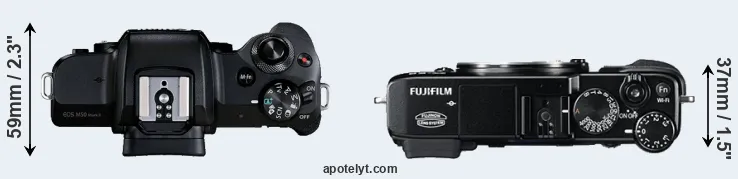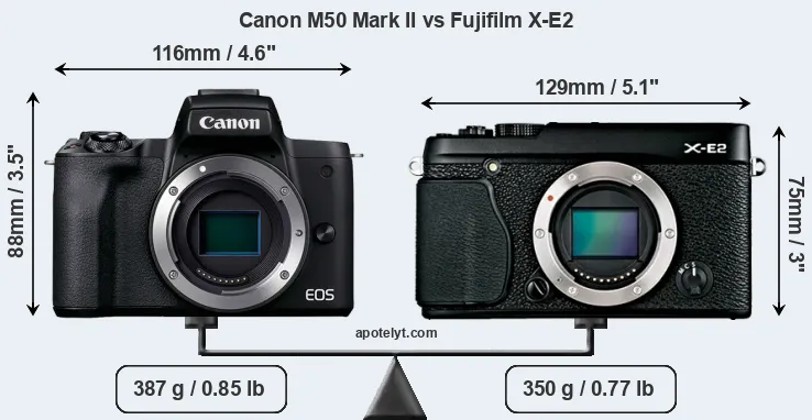 The physical size and weight of the Canon M50 Mark II and the Fujifilm X-E2 are illustrated in the side-by-side display below. The two cameras are presented according to their relative size. Three successive views from the front, the top, and the rear are shown. All width, height and depth measures are rounded to the nearest millimeter.