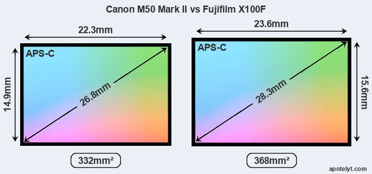 Both cameras under consideration feature an APS-C sensor, but their sensors differ slightly in size. The sensor area in the X100F is 11 percent bigger. As a result of these sensor size differences, the cameras have format factors, respectively, of 1.6 (M50 Mark II) and 1.5. Both cameras have a native aspect ratio (sensor width to sensor height) of 3:2.