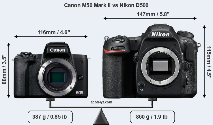 An illustration of the physical size and weight of the Canon M50 Mark II and the Nikon D500 is provided in the side-by-side display below. The two cameras are presented according to their relative size. Three successive views from the front, the top, and the rear are shown. All size dimensions are rounded to the nearest millimeter.
