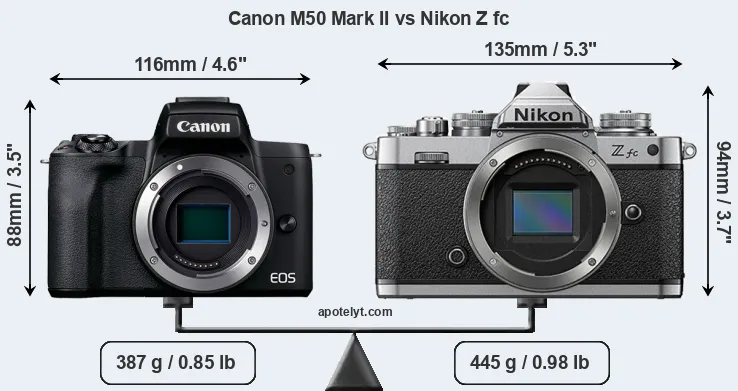 The physical size and weight of the Canon M50 Mark II and the Nikon Z fc are illustrated in the side-by-side display below. The two cameras are presented according to their relative size. Three consecutive views from the front, the top, and the rear side are shown. All width, height and depth measures are rounded to the nearest millimeter.