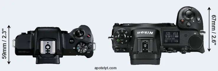 An illustration of the physical size and weight of the Canon M50 Mark II and the Nikon Z6 is provided in the side-by-side display below. The two cameras are presented according to their relative size. Three consecutive perspectives from the front, the top, and the back are available. All size dimensions are rounded to the nearest millimeter.