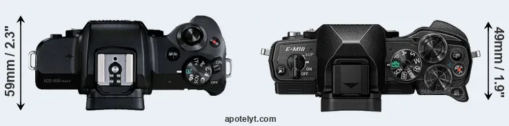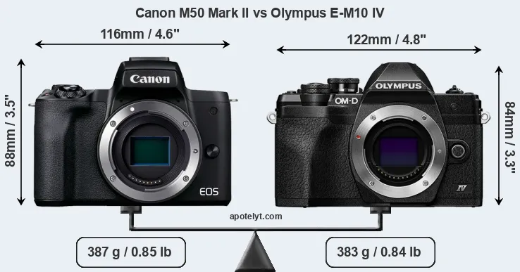 The side-by-side display below illustrates the physical size and weight of the Canon M50 Mark II and the Olympus E-M10 IV. The two cameras are presented according to their relative size. Three consecutive perspectives from the front, the top, and the back are available. All width, height and depth measures are rounded to the nearest millimeter.
