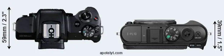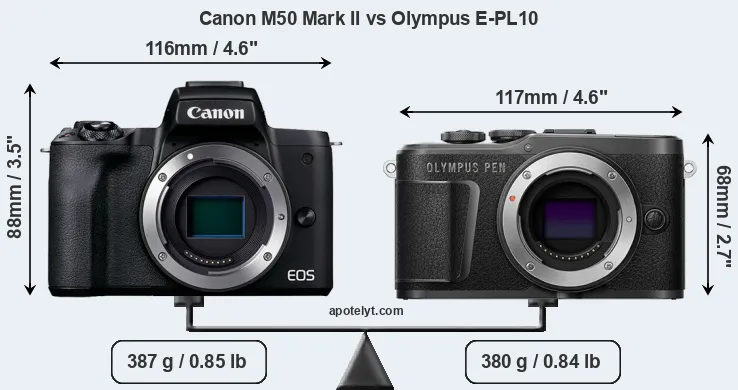 An illustration of the physical size and weight of the Canon M50 Mark II and the Olympus E-PL10 is provided in the side-by-side display below. The two cameras are presented according to their relative size. Three successive views from the front, the top, and the rear are shown. All width, height and depth dimensions are rounded to the nearest millimeter.