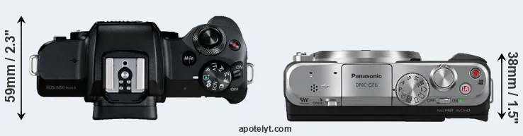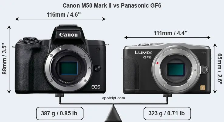 The side-by-side display below illustrates the physical size and weight of the Canon M50 Mark II and the Panasonic GF6. The two cameras are presented according to their relative size. Three consecutive perspectives from the front, the top, and the back are available. All width, height and depth dimensions are rounded to the nearest millimeter.