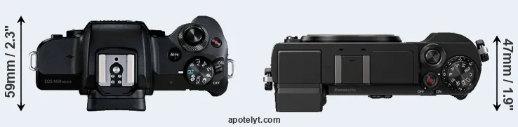 The physical size and weight of the Canon M50 Mark II and the Panasonic GX9 are illustrated in the side-by-side display below. The two cameras are presented according to their relative size. Three consecutive views from the front, the top, and the rear side are shown. All size dimensions are rounded to the nearest millimeter.