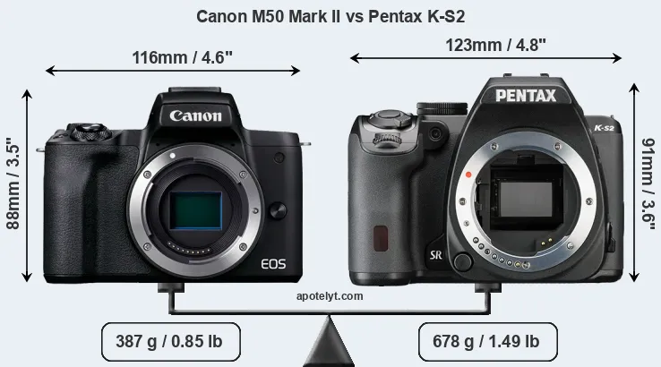 If the front view area (width x height) of the cameras is taken as an aggregate measure of their size, the Pentax K-S2 is notably larger (10 percent) than the Canon M50 Mark II. Moreover, the K-S2 is substantially heavier (75 percent) than the M50 Mark II. It is noteworthy in this context that the K-S2 is splash and dust-proof, while the M50 Mark II does not feature any corresponding weather-sealing.