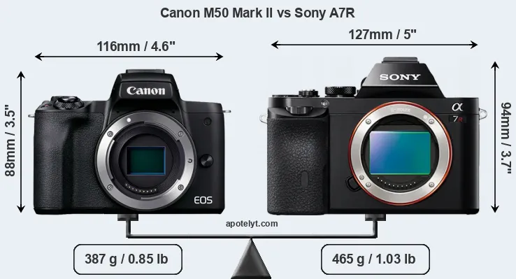 The side-by-side display below illustrates the physical size and weight of the Canon M50 Mark II and the Sony A7R. The two cameras are presented according to their relative size. Three successive views from the front, the top, and the rear are shown. All size dimensions are rounded to the nearest millimeter.