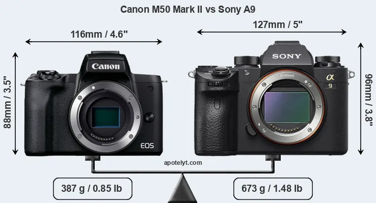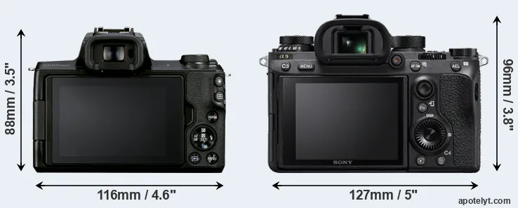 If the front view area (width x height) of the cameras is taken as an aggregate measure of their size, the Sony A9 is notably larger (19 percent) than the Canon M50 Mark II. Moreover, the A9 is substantially heavier (74 percent) than the M50 Mark II. It is noteworthy in this context that the A9 is splash and dust-proof, while the M50 Mark II does not feature any corresponding weather-sealing.