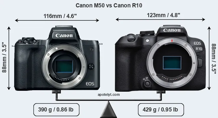 If the front view area (width x height) of the cameras is taken as an aggregate measure of their size, the Canon R10 is notably larger (6 percent) than the Canon M50. Moreover, the R10 is markedly heavier (10 percent) than the M50. In this context, it is worth noting that neither the M50 nor the R10 are weather-sealed.