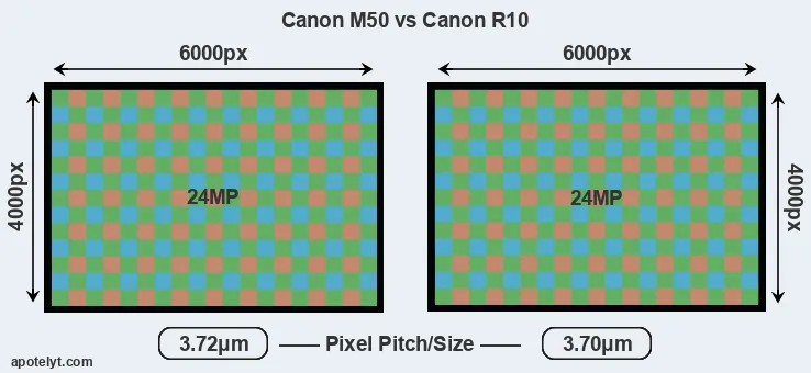 Even though the M50 has a slightly larger sensor, both cameras offer the same resolution of 24 megapixels. This implies that the M50 has a lower pixel density and larger individual pixels (with a pixel pitch of 3.72μm versus 3.70μm for the R10), which gives it a potential advantage in terms of light gathering capacity. It should, however, be noted that the R10 is much more recent (by 4 years and 2 months) than the M50, and its sensor will have benefitted from technological advances during this time that at least partly compensate for the smaller pixel size.