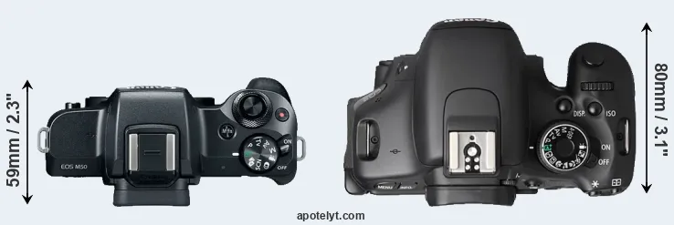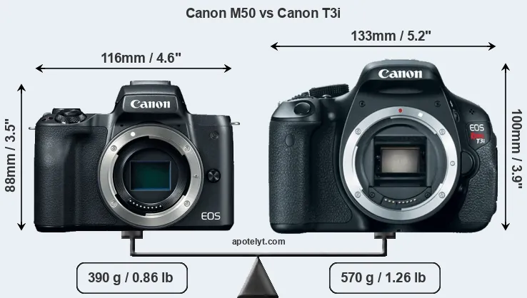 The side-by-side display below illustrates the physical size and weight of the Canon M50 and the Canon T3i. The two cameras are presented according to their relative size. Three consecutive perspectives from the front, the top, and the back are available. All size dimensions are rounded to the nearest millimeter.
