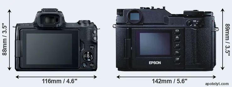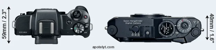 The physical size and weight of the Canon M50 and the Epson R-D1 are illustrated in the side-by-side display below. The two cameras are presented according to their relative size. Three successive views from the front, the top, and the rear are shown. All width, height and depth dimensions are rounded to the nearest millimeter.