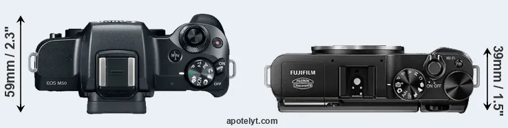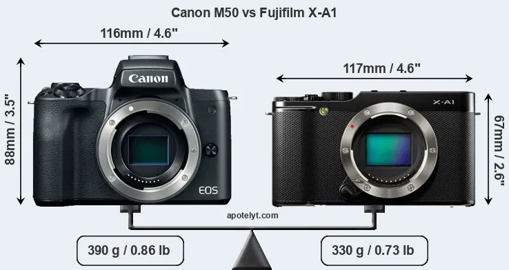 The physical size and weight of the Canon M50 and the Fujifilm X-A1 are illustrated in the side-by-side display below. The two cameras are presented according to their relative size. Three consecutive views from the front, the top, and the rear side are shown. All size dimensions are rounded to the nearest millimeter.