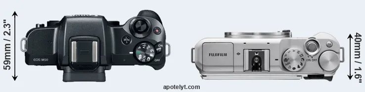 The side-by-side display below illustrates the physical size and weight of the Canon M50 and the Fujifilm X-A5. The two cameras are presented according to their relative size. Three consecutive views from the front, the top, and the rear side are shown. All width, height and depth dimensions are rounded to the nearest millimeter.