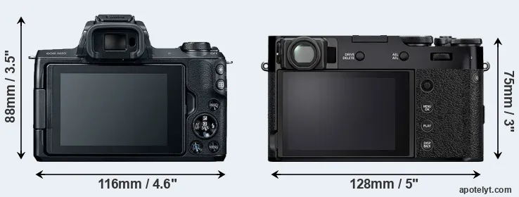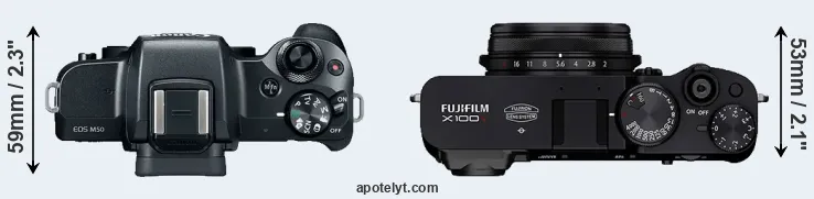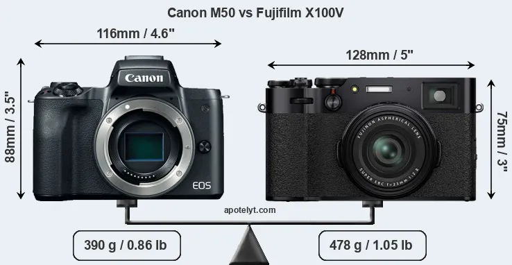 The physical size and weight of the Canon M50 and the Fujifilm X100V are illustrated in the side-by-side display below. The two cameras are presented according to their relative size. Three consecutive perspectives from the front, the top, and the back are available. All width, height and depth dimensions are rounded to the nearest millimeter.
