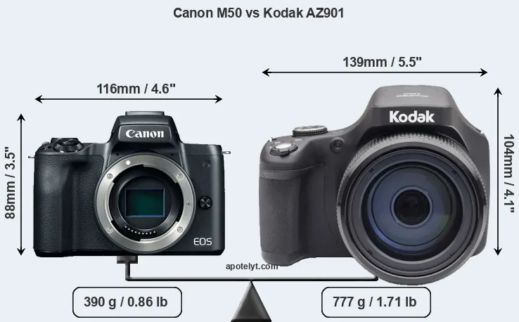 An illustration of the physical size and weight of the Canon M50 and the Kodak AZ901 is provided in the side-by-side display below. The two cameras are presented according to their relative size. Three consecutive views from the front, the top, and the rear side are shown. All width, height and depth dimensions are rounded to the nearest millimeter.