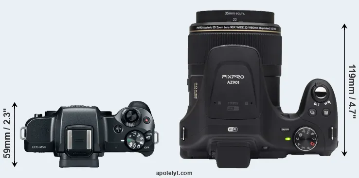 The above size and weight comparisons are to some extent incomplete and possibly misleading, as the AZ901 has a lens built in, whereas the M50 is an interchangeable lens camera that requires a separate lens. Attaching the latter will add extra weight and bulk to the setup.