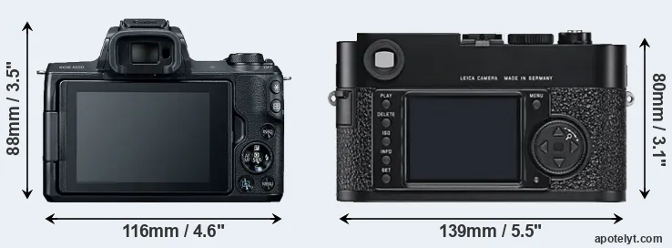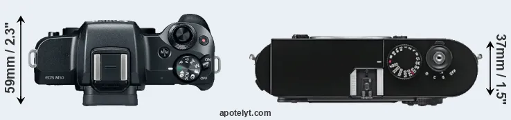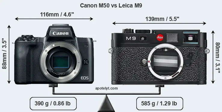 The physical size and weight of the Canon M50 and the Leica M9 are illustrated in the side-by-side display below. The two cameras are presented according to their relative size. Three consecutive views from the front, the top, and the rear side are shown. All width, height and depth measures are rounded to the nearest millimeter.