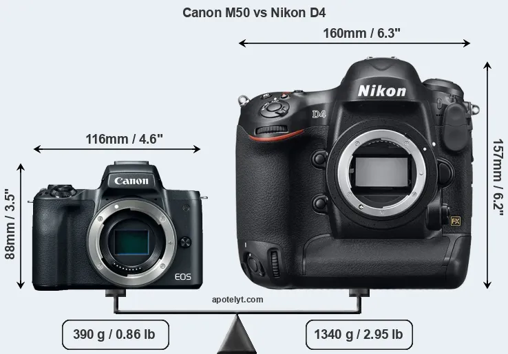 If the front view area (width x height) of the cameras is taken as an aggregate measure of their size, the Nikon D4 is considerably larger (146 percent) than the Canon M50. Moreover, the D4 is substantially heavier (244 percent) than the M50. It is noteworthy in this context that the D4 is splash and dust-proof, while the M50 does not feature any corresponding weather-sealing.