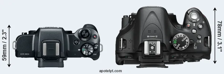 The side-by-side display below illustrates the physical size and weight of the Canon M50 and the Nikon D5200. The two cameras are presented according to their relative size. Three successive views from the front, the top, and the rear are shown. All size dimensions are rounded to the nearest millimeter.
