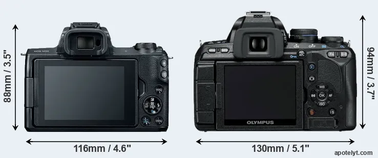 The side-by-side display below illustrates the physical size and weight of the Canon M50 and the Olympus E-600. The two cameras are presented according to their relative size. Three consecutive perspectives from the front, the top, and the back are available. All width, height and depth measures are rounded to the nearest millimeter.