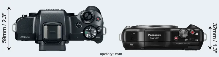 The physical size and weight of the Canon M50 and the Panasonic GF3 are illustrated in the side-by-side display below. The two cameras are presented according to their relative size. Three consecutive views from the front, the top, and the rear side are shown. All size dimensions are rounded to the nearest millimeter.