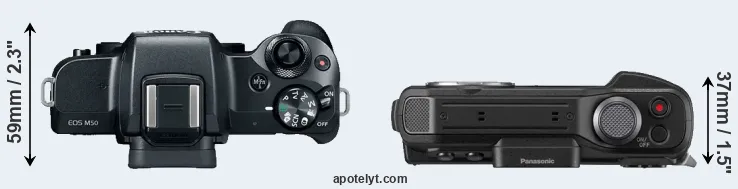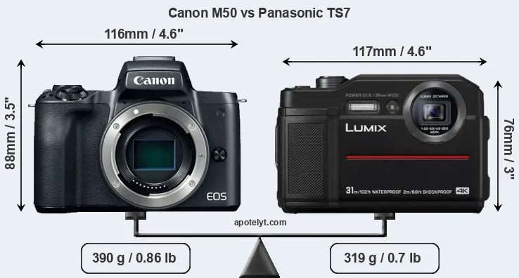 The side-by-side display below illustrates the physical size and weight of the Canon M50 and the Panasonic TS7. The two cameras are presented according to their relative size. Three consecutive views from the front, the top, and the rear side are shown. All width, height and depth dimensions are rounded to the nearest millimeter.