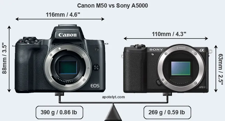 If the front view area (width x height) of the cameras is taken as an aggregate measure of their size, the Sony A5000 is considerably smaller (32 percent) than the Canon M50. Moreover, the A5000 is markedly lighter (31 percent) than the M50. In this context, it is worth noting that neither the M50 nor the A5000 are weather-sealed.