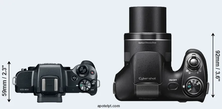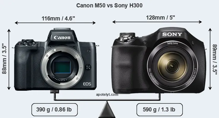 An illustration of the physical size and weight of the Canon M50 and the Sony H300 is provided in the side-by-side display below. The two cameras are presented according to their relative size. Three consecutive perspectives from the front, the top, and the back are available. All size dimensions are rounded to the nearest millimeter.