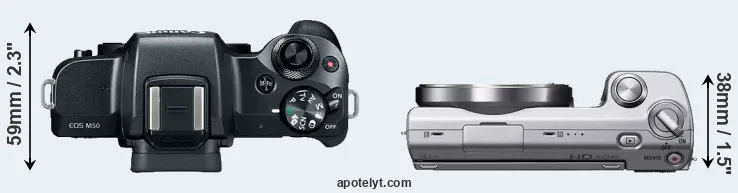 The physical size and weight of the Canon M50 and the Sony NEX-5 are illustrated in the side-by-side display below. The two cameras are presented according to their relative size. Three consecutive perspectives from the front, the top, and the back are available. All size dimensions are rounded to the nearest millimeter.