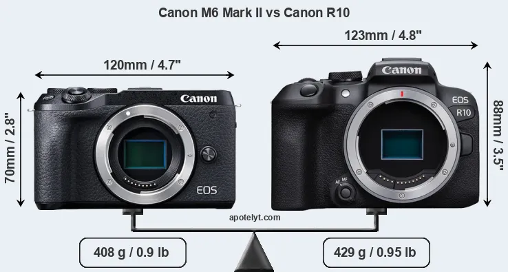 If the front view area (width x height) of the cameras is taken as an aggregate measure of their size, the Canon R10 is notably larger (29 percent) than the Canon M6 Mark II. Moreover, the R10 is markedly heavier (5 percent) than the M6 Mark II. In this context, it is worth noting that neither the M6 Mark II nor the R10 are weather-sealed.