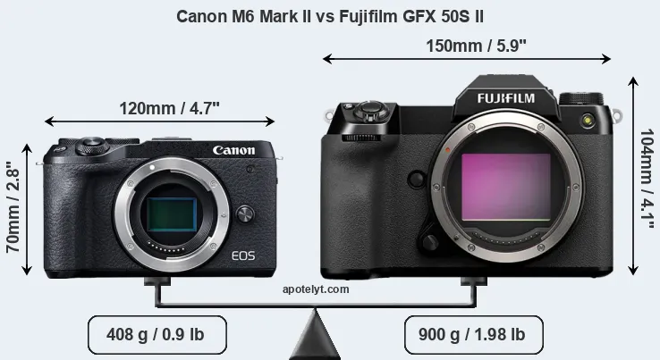If the front view area (width x height) of the cameras is taken as an aggregate measure of their size, the Fujifilm GFX 50S II is considerably larger (86 percent) than the Canon M6 Mark II. Moreover, the GFX 50S II is substantially heavier (121 percent) than the M6 Mark II. It is noteworthy in this context that the GFX 50S II is splash and dust-proof, while the M6 Mark II does not feature any corresponding weather-sealing.