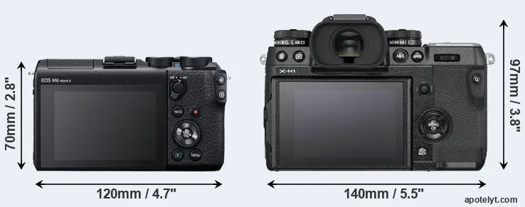 If the front view area (width x height) of the cameras is taken as an aggregate measure of their size, the Fujifilm X-H1 is considerably larger (62 percent) than the Canon M6 Mark II. Moreover, the X-H1 is substantially heavier (65 percent) than the M6 Mark II. It is noteworthy in this context that the X-H1 is splash and dust-proof, while the M6 Mark II does not feature any corresponding weather-sealing.