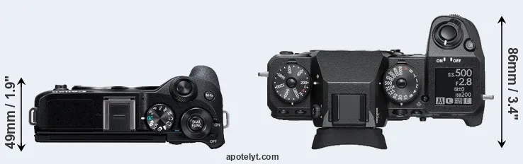 The physical size and weight of the Canon M6 Mark II and the Fujifilm X-H1 are illustrated in the side-by-side display below. The two cameras are presented according to their relative size. Three consecutive perspectives from the front, the top, and the back are available. All width, height and depth dimensions are rounded to the nearest millimeter.