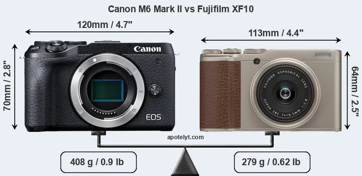The side-by-side display below illustrates the physical size and weight of the Canon M6 Mark II and the Fujifilm XF10. The two cameras are presented according to their relative size. Three consecutive views from the front, the top, and the rear side are shown. All width, height and depth dimensions are rounded to the nearest millimeter.