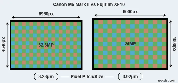 Despite having a smaller sensor, the Canon M6 Mark II offers a higher resolution of 32.3 megapixels, compared with 24 MP of the Fujifilm XF10. This megapixels advantage comes at the cost of a higher pixel density and a smaller size of the individual pixel (with a pixel pitch of 3.23μm versus 3.92μm for the XF10). However, it should be noted that the M6 Mark II is a somewhat more recent model (by 1 year and 1 month) than the XF10, and its sensor might have benefitted from technological advances during this time that partly offset its pixel-size disadvantage.