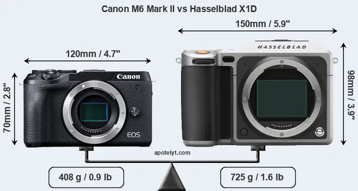 If the front view area (width x height) of the cameras is taken as an aggregate measure of their size, the Hasselblad X1D is considerably larger (75 percent) than the Canon M6 Mark II. Moreover, the X1D is substantially heavier (78 percent) than the M6 Mark II. It is noteworthy in this context that the X1D is splash and dust-proof, while the M6 Mark II does not feature any corresponding weather-sealing.