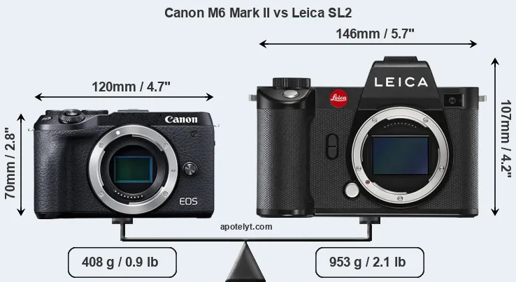 The physical size and weight of the Canon M6 Mark II and the Leica SL2 are illustrated in the side-by-side display below. The two cameras are presented according to their relative size. Three consecutive perspectives from the front, the top, and the back are available. All width, height and depth dimensions are rounded to the nearest millimeter.