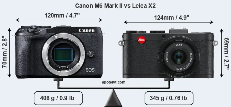 The physical size and weight of the Canon M6 Mark II and the Leica X2 are illustrated in the side-by-side display below. The two cameras are presented according to their relative size. Three consecutive views from the front, the top, and the rear side are shown. All width, height and depth measures are rounded to the nearest millimeter.