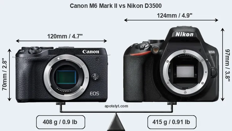 The physical size and weight of the Canon M6 Mark II and the Nikon D3500 are illustrated in the side-by-side display below. The two cameras are presented according to their relative size. Three consecutive perspectives from the front, the top, and the back are available. All width, height and depth dimensions are rounded to the nearest millimeter.