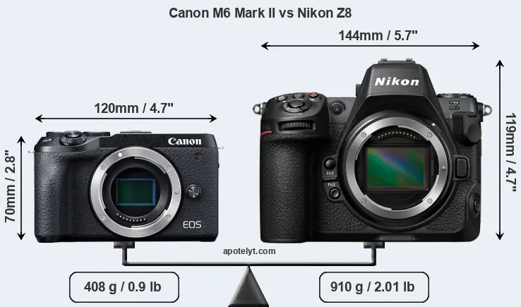 If the front view area (width x height) of the cameras is taken as an aggregate measure of their size, the Nikon Z8 is considerably larger (104 percent) than the Canon M6 Mark II. Moreover, the Z8 is substantially heavier (123 percent) than the M6 Mark II. It is noteworthy in this context that the Z8 is splash and dust-proof, while the M6 Mark II does not feature any corresponding weather-sealing.