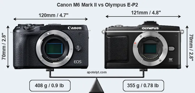The physical size and weight of the Canon M6 Mark II and the Olympus E-P2 are illustrated in the side-by-side display below. The two cameras are presented according to their relative size. Three consecutive perspectives from the front, the top, and the back are available. All width, height and depth dimensions are rounded to the nearest millimeter.